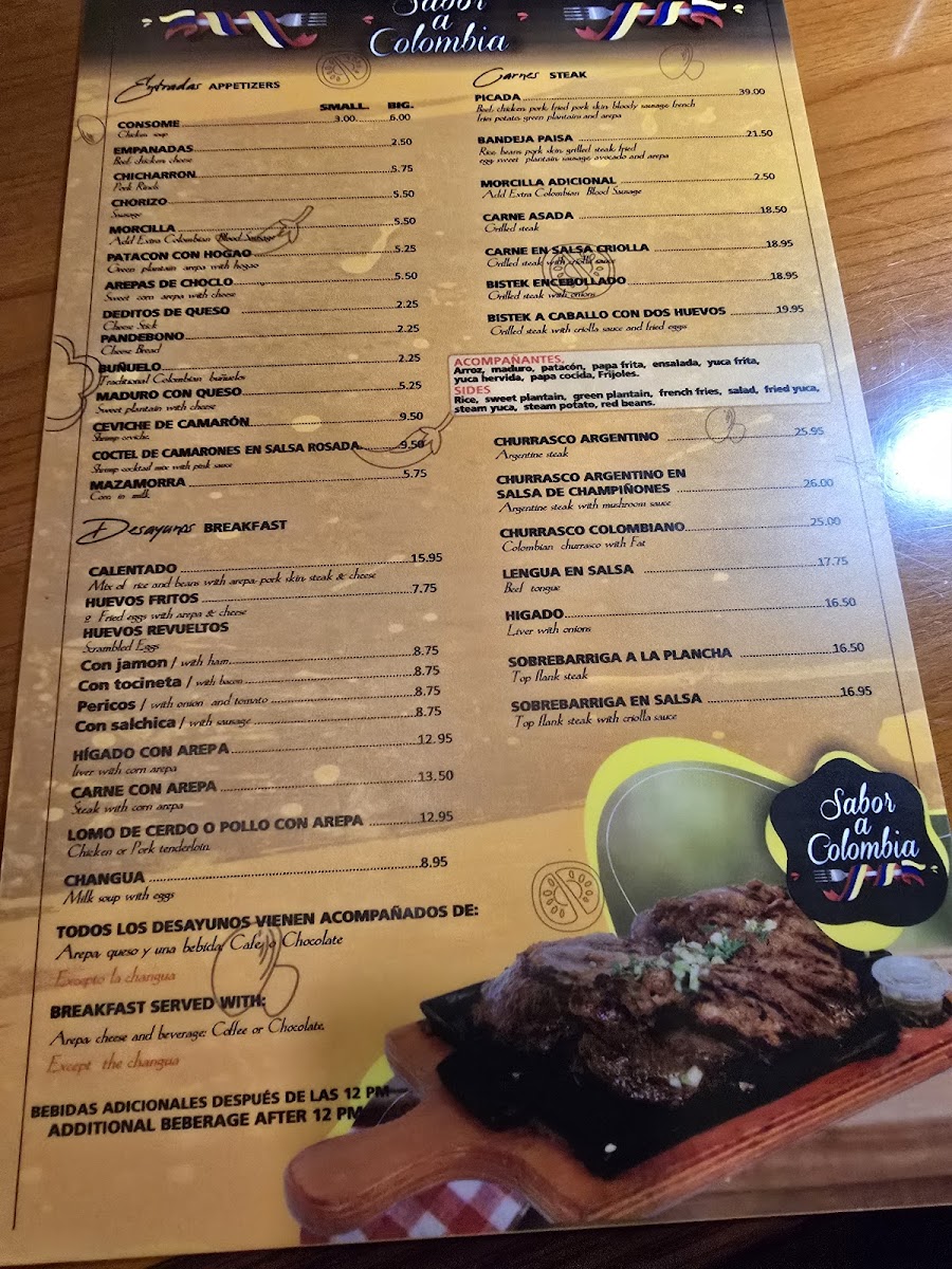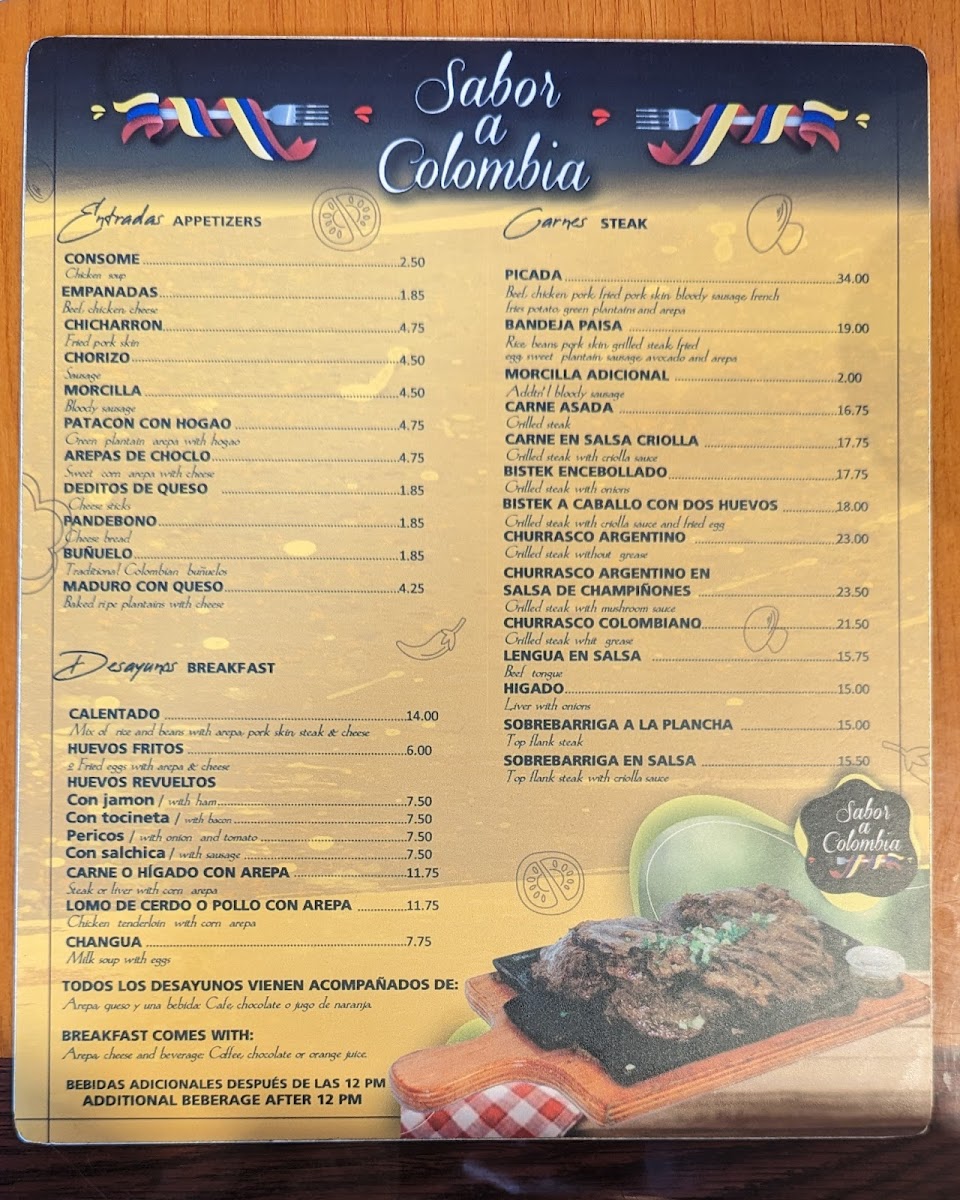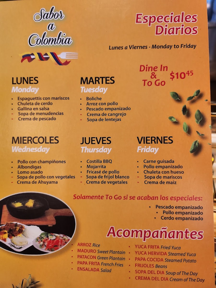 The menu supports both casual dining experiences and quick orders, suitable for breakfast, lunch, and dinner. Visitors can choose from light meals to more substantial dishes reflecting authentic Colombian flavors.